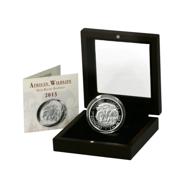 מטבע כסף בעל תבליט גבוה פיל סומליה African Wildlife Elephant Silver Coin Proof 1 Oz 2013 הוא חלק מסדרת חיות הבר האפריקניות. הסדרה הושקה לראשונה ב-1999 כאוסף הפיל של זמביה ונמשכה ככזו עד 2003. החל משנת 2004, הקולקציה נודעה בשם הפיל סומליה והתרחבה והפכה לאחת מאוספי מטבעות הכסף המובילים בעולם.