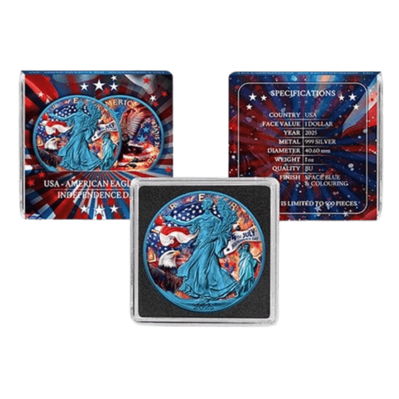 מטבע כסף American Eagle – Independence Day Silver Coin 1 Oz 2025 מציין את יום העצמאות של ארצות הברית, שחל ב-4 ביולי, יום השנה לחתימה על הכרזת העצמאות. ב-1776 הכריזו 13 מושבות על הפרדה מבריטניה הגדולה. זהו חג לאומי חשוב – נחגג בזיקוקים, תהלוכות, מנגלים וקונצרטים.