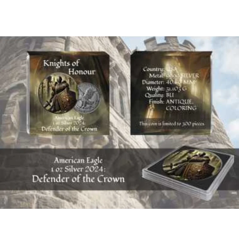 מטבע כסף צבעוני וגימור עתיק American Eagle Knights of Honour – Defender of the Crown 1 Oz 2024 הוא חלק מסדרת אבירי הכבוד. אבירי כבוד הם אבירים, המכובדים על נאמנותם הבלתי מעורערת ואומץ לבם מול סכנה.