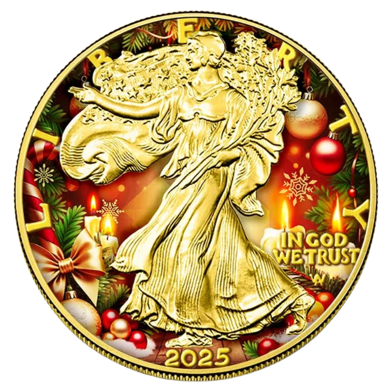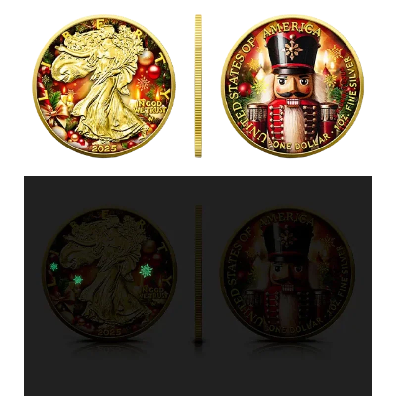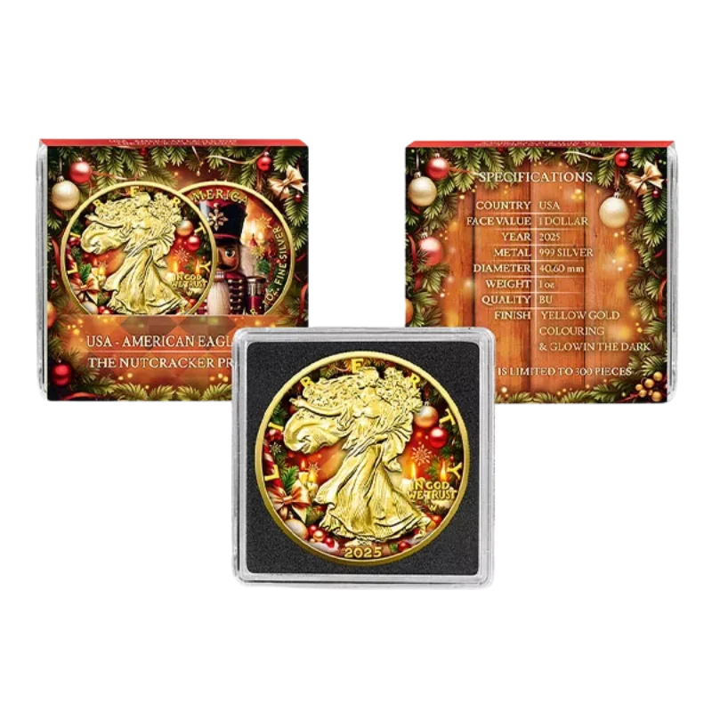 מטבע כסף בציפוי זהב צהוב, צבעוני וזוהר בחושך American Eagle – The Nutcracker Prince Silver Coin Glow in Dark 1 Oz 2025 הוטבע ע״י בית המטבעה של גרמניה מינט. המטבע מציג את מפצח האגוזים, סמל לכוח, הגנה וקסם חגיגי – דמות נצחית מפולקלור החגים שריתק דורות.