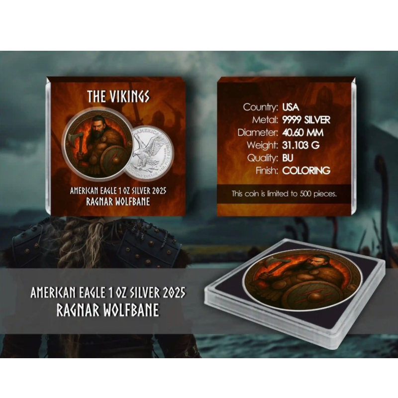 מטבע כסף בהדפס UV בצבע מלא American Eagle – The Vikings – Ragnar Wolfbane 1 Oz 2025 הוא המטבע האחרון שהופק כחלק מסדרת הוויקינגים המפורסמים ביותר בהיסטוריה.