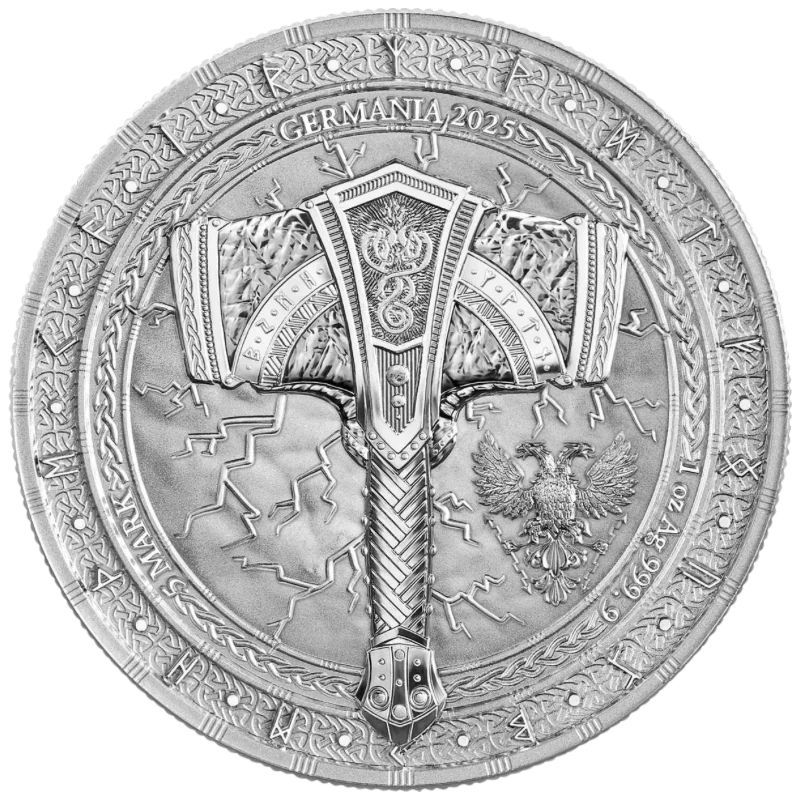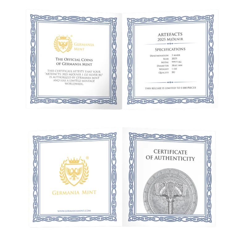 מטבע כסף Artefacts Mjolnir 1 Oz 2025 מציג את הפטיש האגדי של תור. הנשק הבלתי מנוצח חושל על ידי הגמדים סינדרי וברוק כאחת משלוש מתנות יוצאות דופן לאלים. Mjölnir אפשר לתור להכות בכוח בלתי מוגבל, וברגע שנזרק – הוא תמיד היה חוזר לידו. הוא גם סימל את הגנת אסגרד מפני התקפות ענקים.