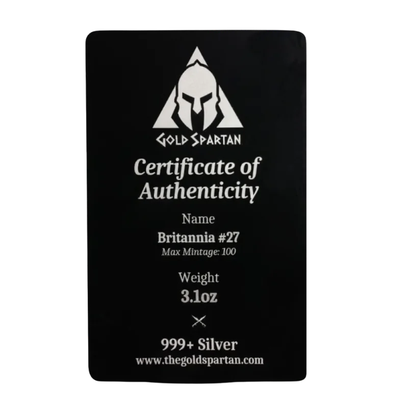 פסל בריטניה מכסף יצוק בעבודת יד בגימור עתיק Britannia Silver Cast Statue 3 Oz Antiqued מציג האנשה של בריטניה עומדת, סמל לעוצמה וזהות לאומית. מקורותיה נעוצים בכיבוש הרומי של האיים הבריטיים במאה ה-1 לספירה, שם היא הופיעה לראשונה כלוחמת חובשת קסדה, חמושה בחנית ובמגן. בריטניה הופיעה לראשונה על מטבעות רומיים תחת הקיסר אדריאנוס בסביבות שנת 119 לספירה.