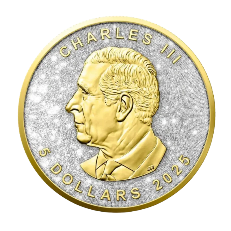 מטבע כסף קנדי בציפוי זהב חלקי ואבקת יהלומים Canadian Maple Leaf 1 Oz 2025 הוא אחד המטבעות הפופולריים ביותר בקרב משקיעים. המטבע מציג את סמל קנדה, שהוא עלה האדר, ומוטבע מאז 1988.