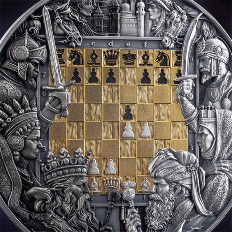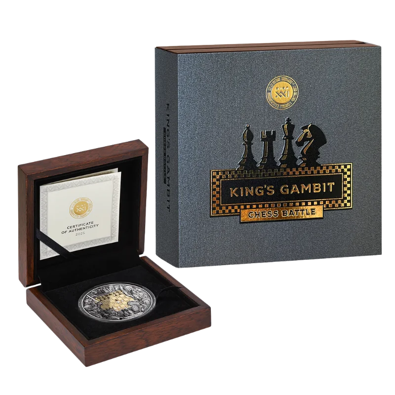 מטבע כסף בעל תבליט גבוה בגימור עתיק וציפוי זהב חלקי Chess Battle – King's Gambit Silver Gilded Coin Antiqued 3 Oz 2025 מסמן את פתיחת סדרת קרב השחמט – מחווה לאחת האסטרטגיות הנועזות ביותר בהיסטוריה של השחמט.