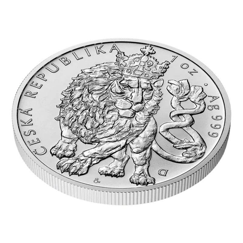 Czech Lion Silver Coin 1 Oz 2026 – סדרת האריות הצ'כית. מטבע כסף האריה הצ'כי הוא המטבע הראשון מצ'כיה המציג סמלים של הרפובליקה הצ'כית. האגדה על ברונצוויק, נסיך מיתי שנסע לאפריקה, שם עזר למלך החיות להילחם בדרקון, שייך לסיפור המפורסם ביותר על איך אריה אקזוטי הפך לסמל של מדינת צ'כיה. גב המטבע מציג את האריה הצ'כי כסמל של הרפובליקה הצ'כית עם ענף טיליה – העץ הלאומי הצ'כי.