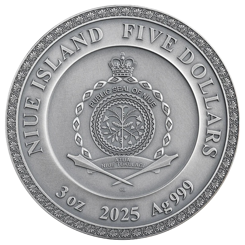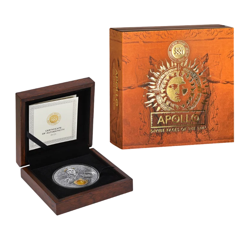 מטבע כסף Divine Faces Of The Sun – Apollo 3 Oz 2025 בעל תבליט גבוה, בגימור עתיק, בציפוי זהב חלקי ומשובץ באבן עַנבָּר הוא החמישי בסדרה "הפנים האלוהיות של השמש".