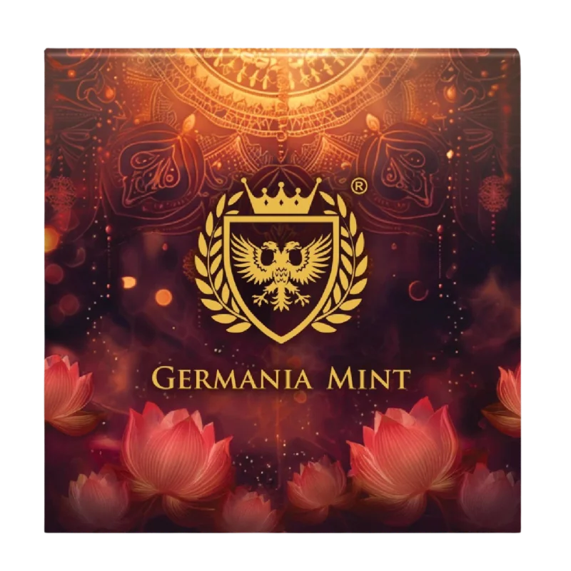 מטיל כסף יצוק צבעוני Diwali – Lakszmi Silver Cast Bar 2 Oz 2025, שעוצב לכבוד דיוואלי, פסטיבל האורות ההינדי, החוגג את ניצחון הטוב על הרע, הידע על הבורות והאור על החושך. לקשמי – אלת המזל, העושר והיופי.