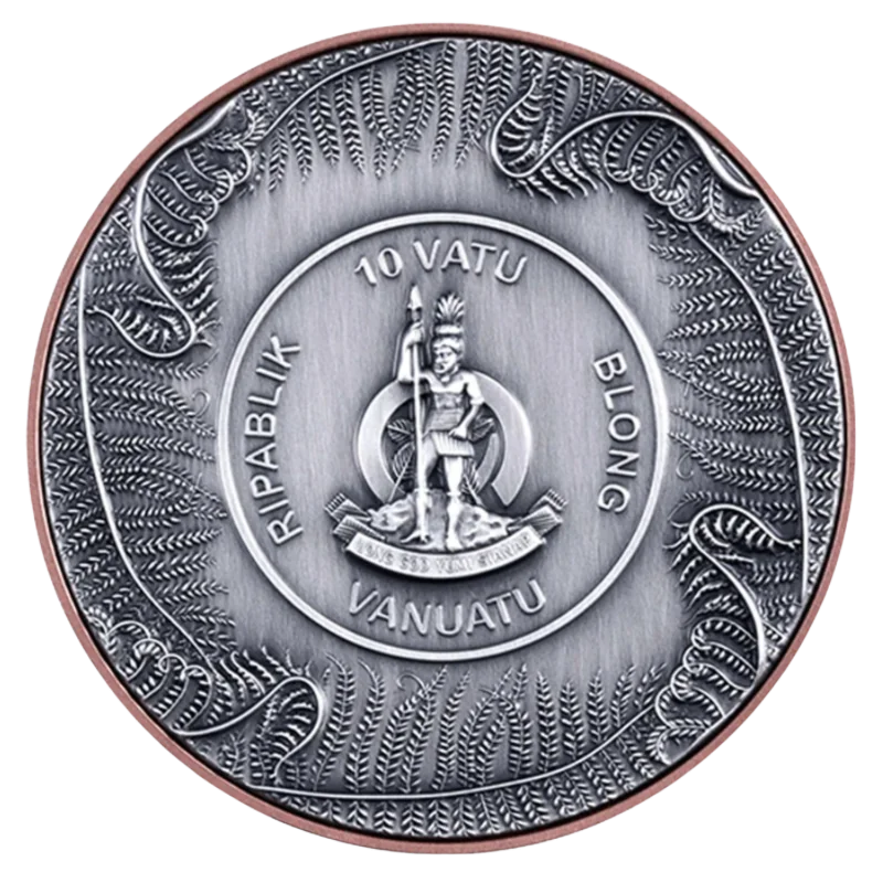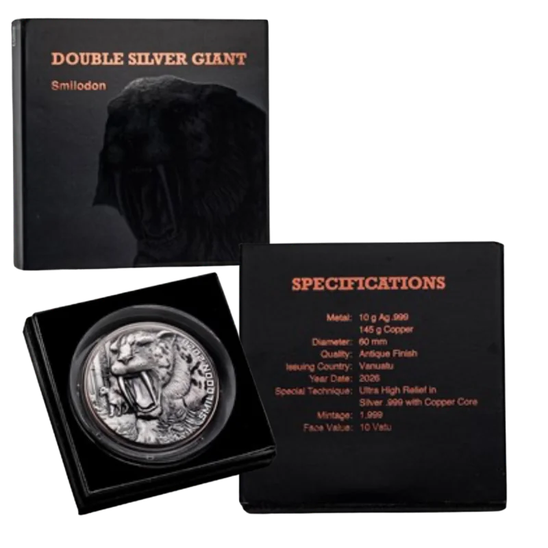 מטבע כסף בעל תבליט גבוה בגימור עתיק, מיוצר בטכניקת הבי-מטאל פרימיום, 145 גרם נחושת ו-10 גרם כסף. Double Silver Giant Predators – Smilodon 10 Gram Silver 145 Gram Copper 2026 מסדרת "טורפים ענקיים כפולים".