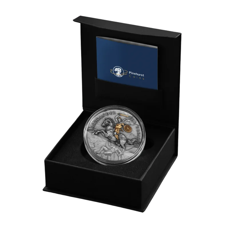 מטבע כסף בציפוי זהב חלקי וגימור עתיק “Alexander The Great 2 Oz 2023” מסדרת "הלוחמים האגדיים", המוקדש ללוחמים המפורסמים ביותר בהיסטוריה.