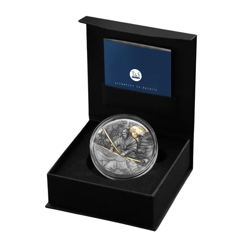 מטבע כסף בציפוי זהב חלקי וגימור עתיק Legendary Warriors – Miyamoto Musashi Silver Gilded Coin Antiqued 2 Oz 2025 מסדרת "הלוחמים האגדיים", מוקדש ללוחמים המפורסמים ביותר בהיסטוריה.