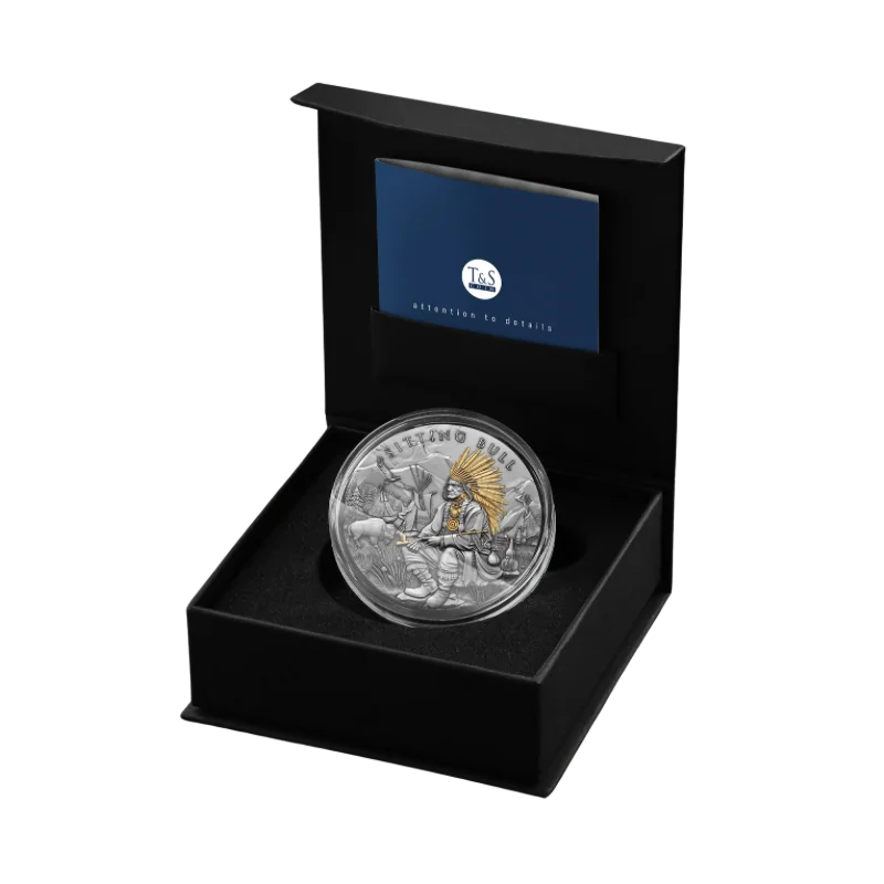 מטבע כסף בציפוי זהב חלקי וגימור עתיק Legendary Warriors – Sitting Bull Silver Gilded Coin Antiqued 2 Oz 2023 מסדרת "הלוחמים האגדיים", מוקדש ללוחמים המפורסמים ביותר בהיסטוריה.