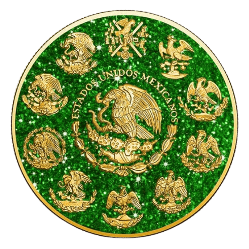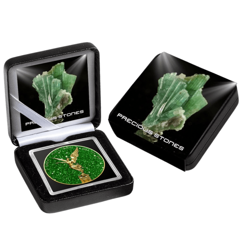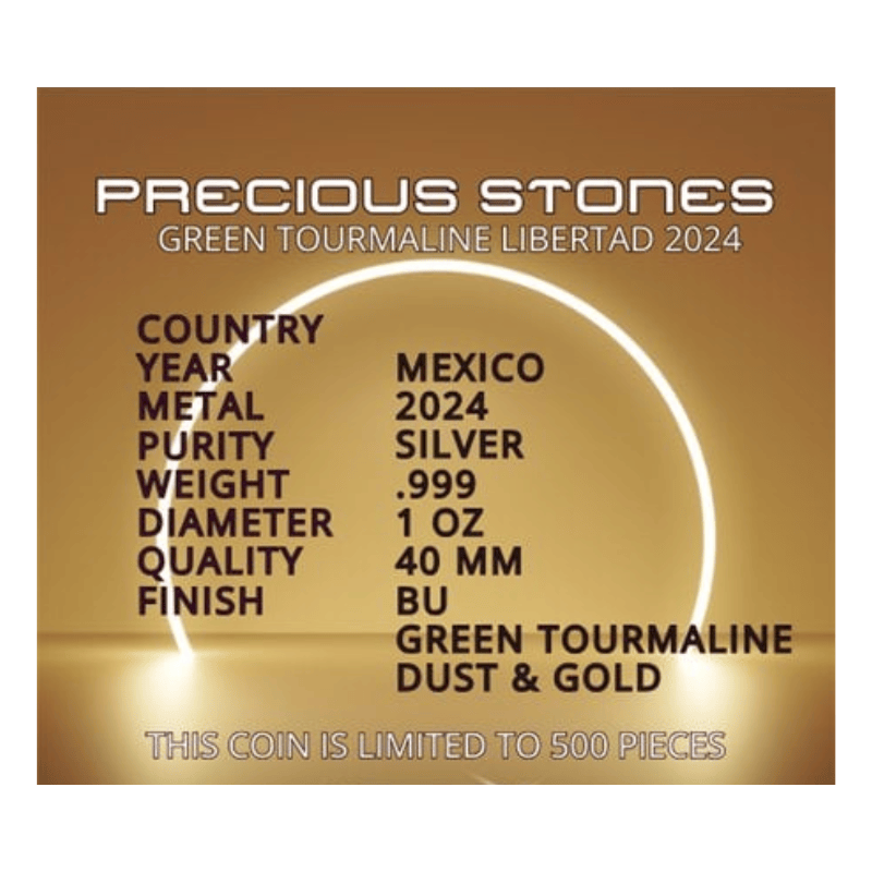 מטבע כסף בציפוי אבקת טורמלין ירוק וציפוי זהב Libertad Precious Gemstones – GREEN TOURMALINE Silver Coin 1 Oz 2024 מסדרת "אבנים יקרות" והוא מוקדש לליברטד המקסיקני.