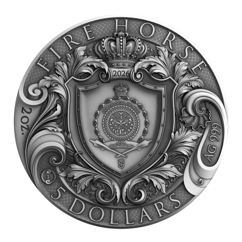 מטבע כסף בציפוי זהב וגימור עתיק משובץ באבן קריסטל Lunar Years – Fire Horse Silver Gilded Coin Antiqued 2 Oz 2026 הוא המהדורה הראשונה בסדרת שנות הירח, של לוח השנה הירחי.