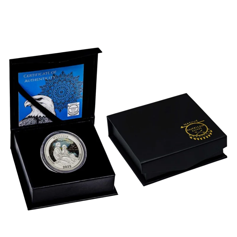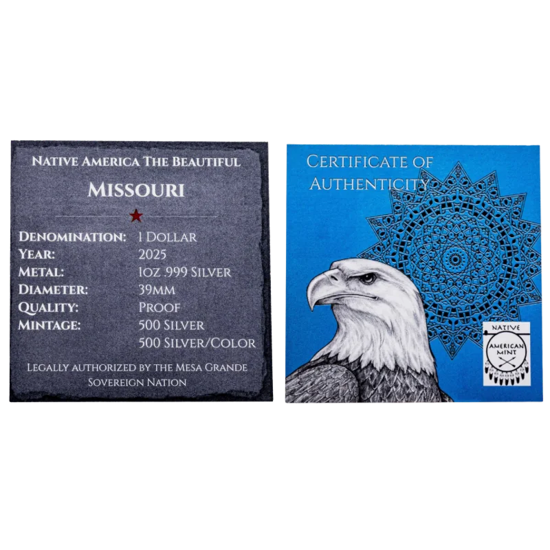 מטבע כסף צבעוני Native America The Beautiful – Missouri Silver Color Coin 1 Oz 2025 מסדרת "אמריקה הילידית היפה", שנוצרה על ידי מטבעת הילידים האמריקאים, מדגישה מקומות היסטוריים ונושאים של תוכנית "אמריקה היפה" של מטבעת ארה"ב דרך נקודות המבט של העמים הילידים של צפון אמריקה.