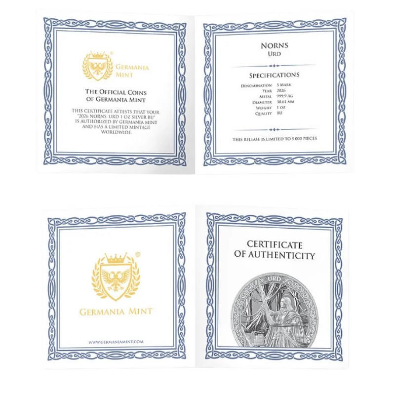מטבע כסף אורד Norns – Urd Silver Coin 1 Oz 2026, הבכורה מבין הנורנים, פירוש שמה הוא "מה שהיה", ובחוכמה עתיקה זו טמון כוחה. כל אירוע, פעולה והחלטה שכבר התרחשו זורמים אליה כמו נהר של זיכרונות. מהם, אורד טווה את חוטי הגורל, ומלמדת שהעבר מהווה את הבסיס להווה ומנחה בשקט את העתיד.