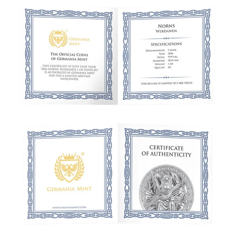 מטבע כסף ורדנדה Norns – Werdanda Silver Coin 1 Oz 2026, הידועה גם בשם ורדנדי , פירושה "מה שקורה" והיא הנורנה של ההווה. תפקידה הוא להתבונן באירועים מתמשכים ולהשפיע בעדינות על מהלכם על ידי שילוב הגורל ברגע. ורדנדה מסמלת פעילות, דינמיקת חיים ואת הצורך לפעול "כאן ועכשיו". תחת הדרכתה, ההווה הופך לגשר המחבר בין העבר לעתיד.