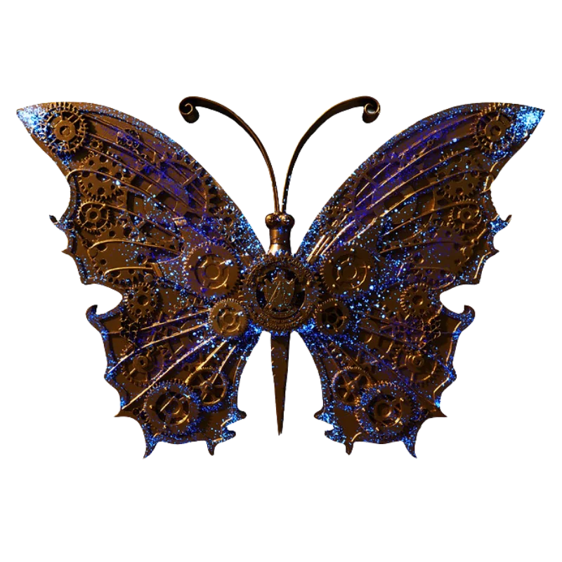מטבע כסף בצורת פרפר בעל תבליט גבוה, ציפוי זהב וצביעת UV (זוהר בחושך) Steampunk Mech Butterfly Shaped Silver Glided Coin 2 Oz 2025 הוא חלק מסדרת "Steampunk Allegiance".