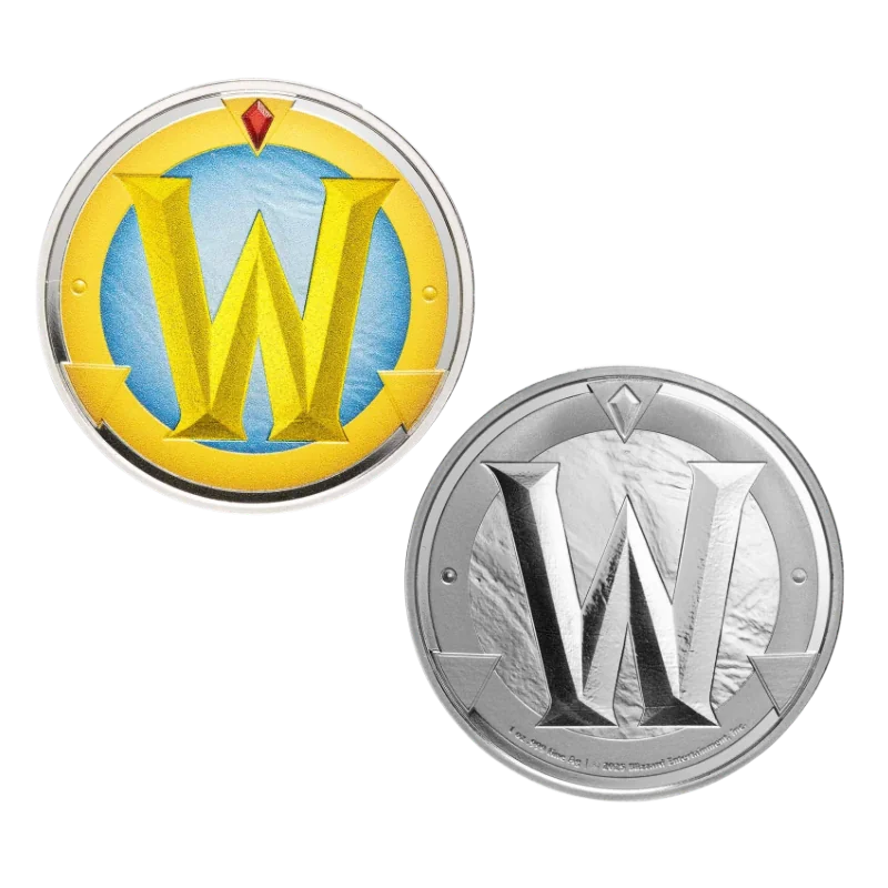 חזית המטבע מציג אסימון WoW הרפליקה צבעוני, יחד עם הסמל World of Warcraft המוכר. צד זה מציג רקע כחול עם "W" מוזהב וטבעת זהב תואמת, יחד עם אבן חן אדומה בחלק העליון של האסימון.