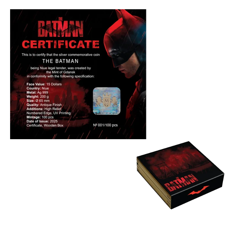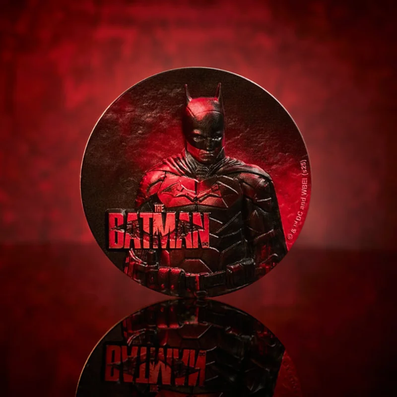 מטבע כסף בעל תבליט גבוה בגימור עתיק והדפסת UV צבעונית The Batman Gotham Silver Coin 200 Gram 2026 בהשראת הסרט באטמן (2022)