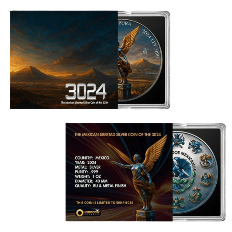 מטבע כסף מקסיקני קלאסי ליברטד, המוקרן לעתיד הרחוק – לשנת 3024. Libertad THE FUTURE COIN 3024 1 Oz Silver Color Coin Mexico 2024