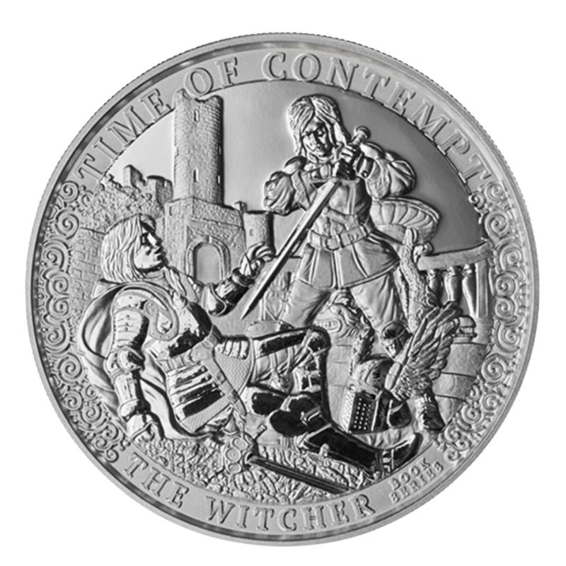 מטבע כסף The Witcher – Time of Contempt Silver Coin 2 Oz 2025 שהונפק על ידי הרפובליקה של קמרון הוא חלק מסדרת המטבעות של המכשף ומנציח את אחד הפרקים הדרמטיים והמשנות ביותר בסאגה של אנדז'יי ספקקובסקי – "זמן הבוז".