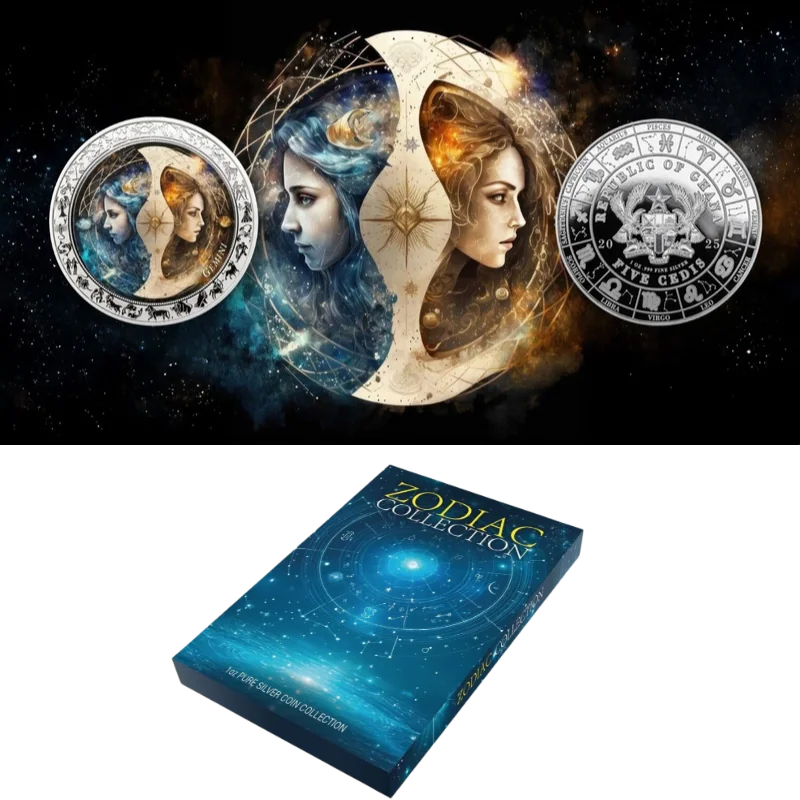מטבע כסף צבעוני Zodiac Space – Gemini Silver Color Coin Proof 1 Oz 2025 מסדרת גלגל המזלות ״Zodiac Space״ של גאנה.